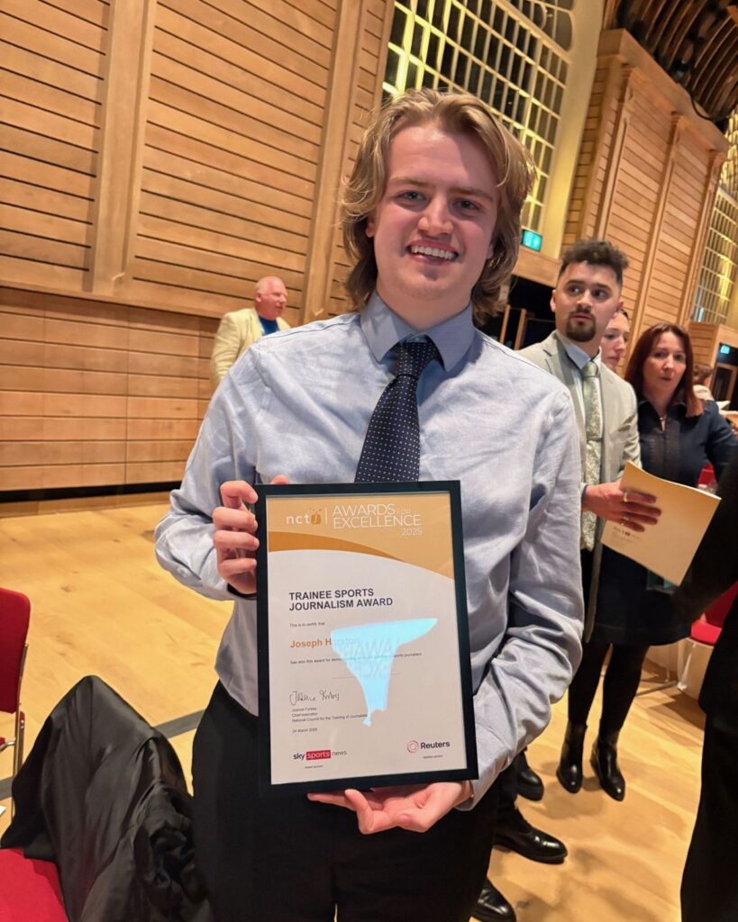 Joe Harston, an apprentice from The Times currently studying for his NCTJ Diploma at the Academy, was delighted to be crowned Trainee Sports Journalist of the year by Mark Alford, the Director of Sky Sports News.